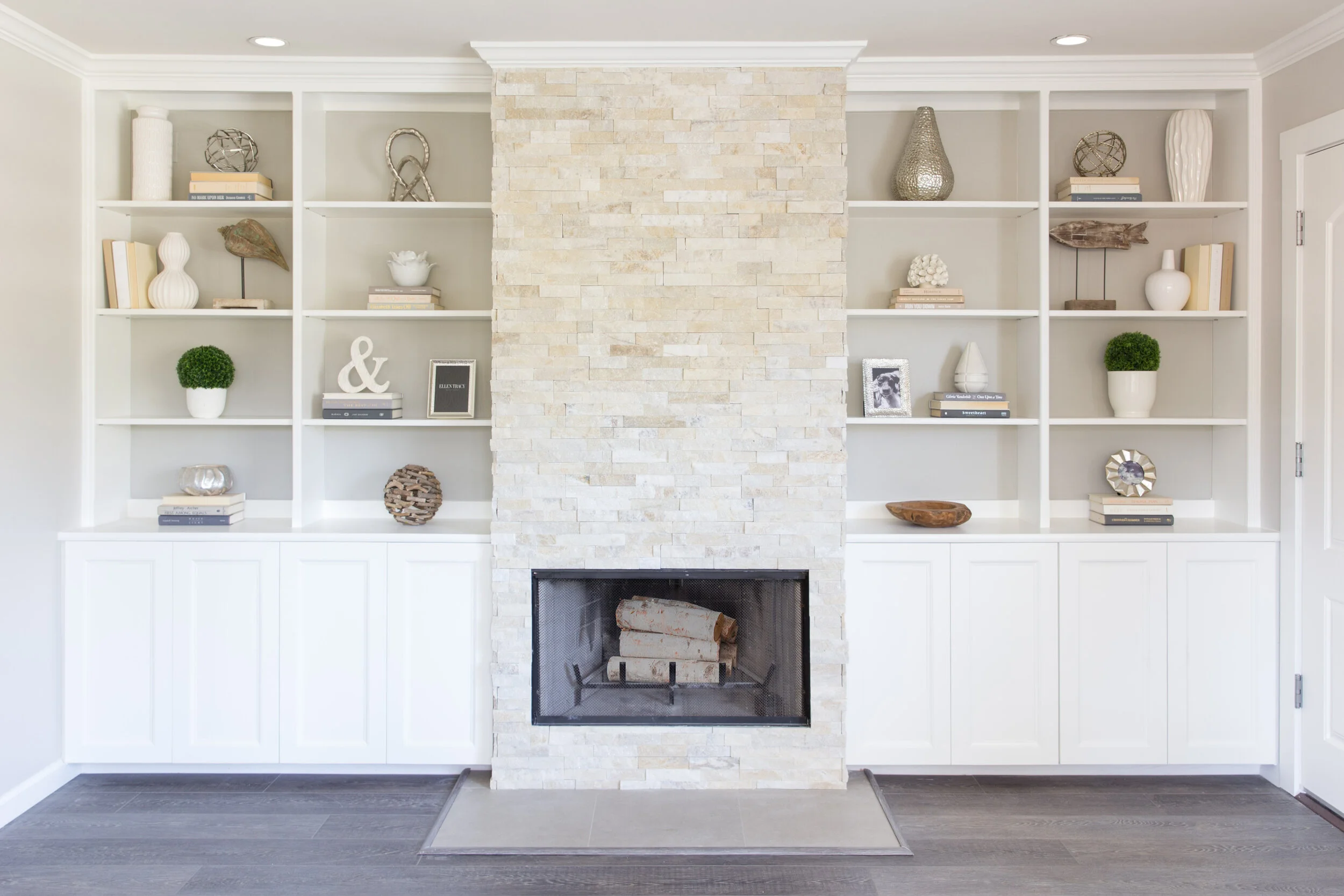 In the end, we decided to keep the beautiful built-in cabinets flanking the fireplace. We eliminated some of the shelves, painted the back wall a light grey, refinished the fireplace facade, and added a wood trim to the cabinet doors to make them a little more interesting. We also added some fun knobs (not seen here).